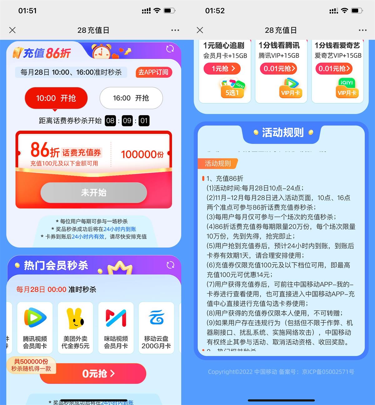 微信打开地址->10点、16点整抢86折话费券,限量20万份->下拉还有0元抽影音会员美团券等