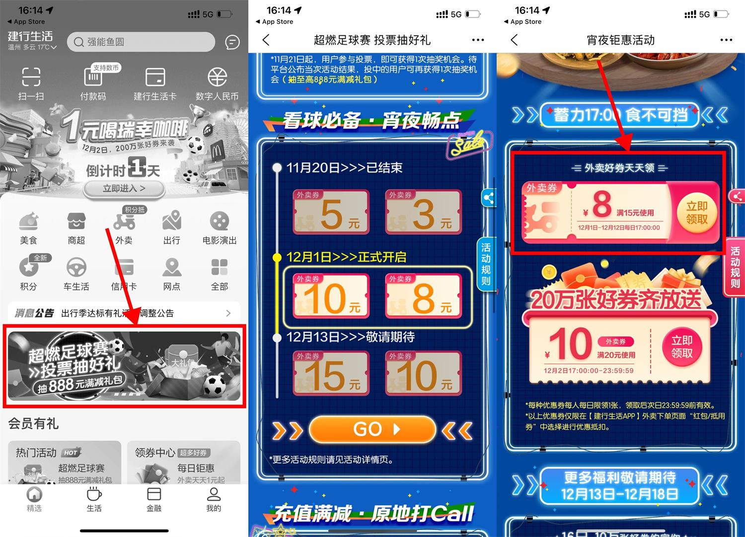 建行生活APP->首页横幅进入->下拉准点抢15减8元外卖券,可叠加饿了么红包使用!