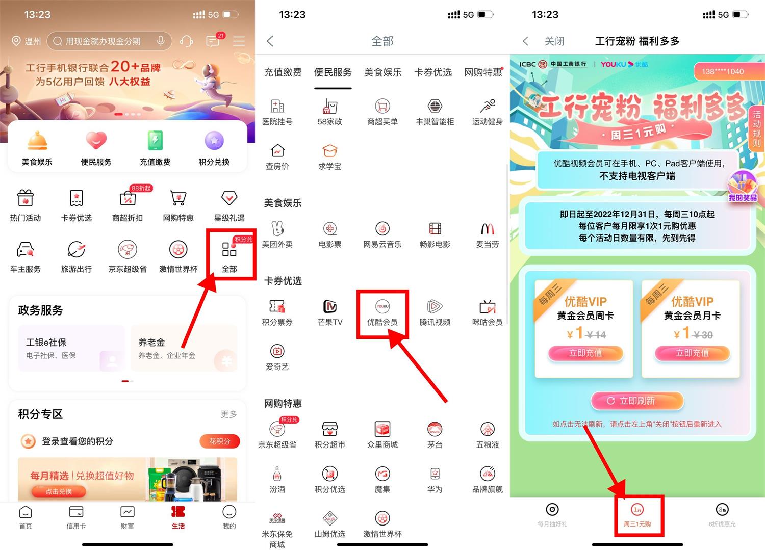浏览器打开地址->跳转到工行APP->底部“周三1元购”->直接1元开优酷会员月卡
