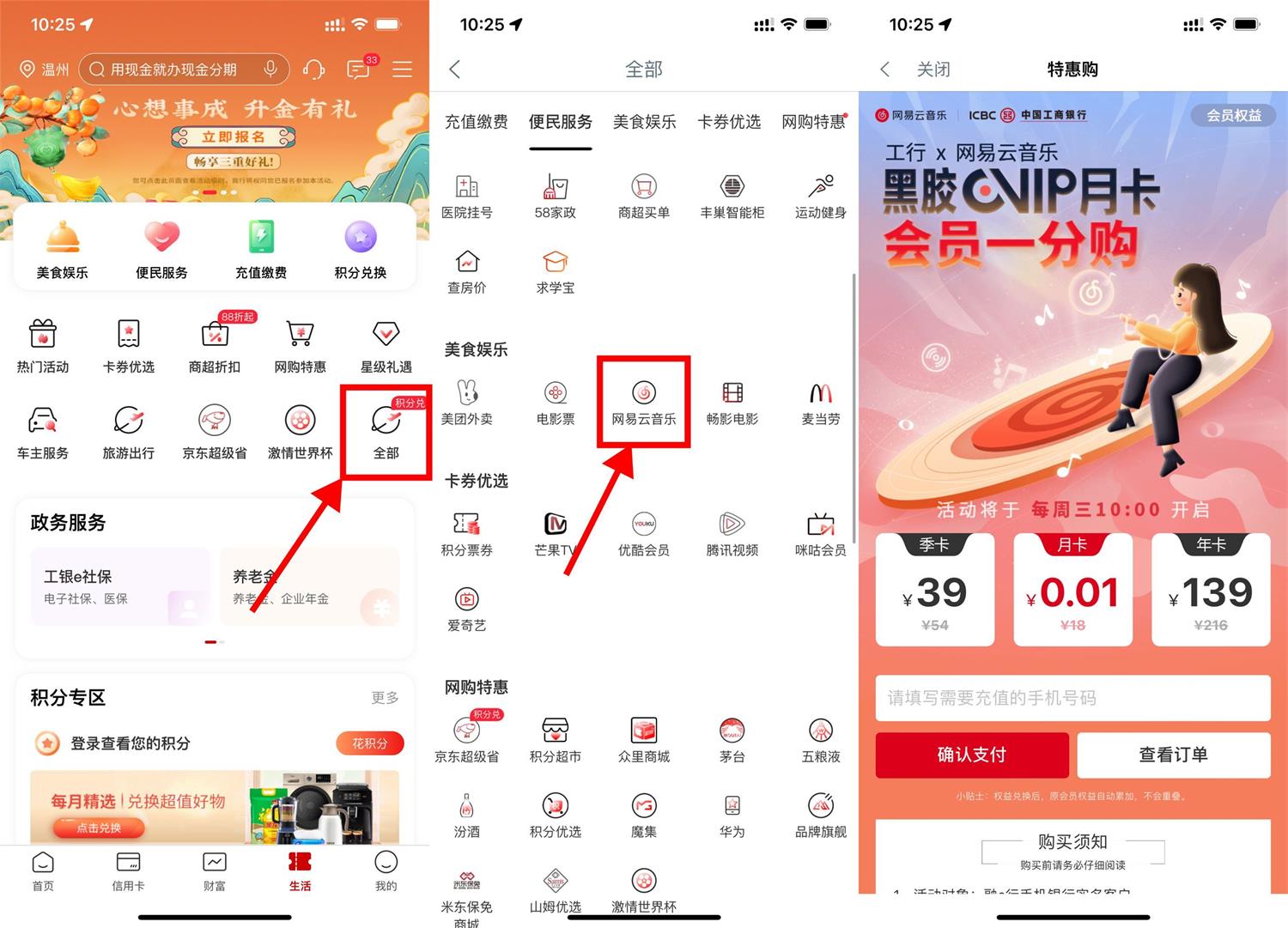 工行APP底部“生活”->全部->网易云音乐->进入直接填写号码0.01元到手