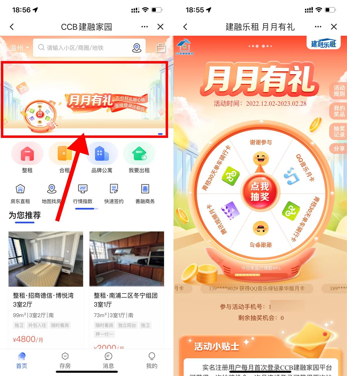 建行APP搜索“建融家园”->横幅“月月有礼”->默认有1次机会,抽绿钻、腾讯视频、青桔单车月卡