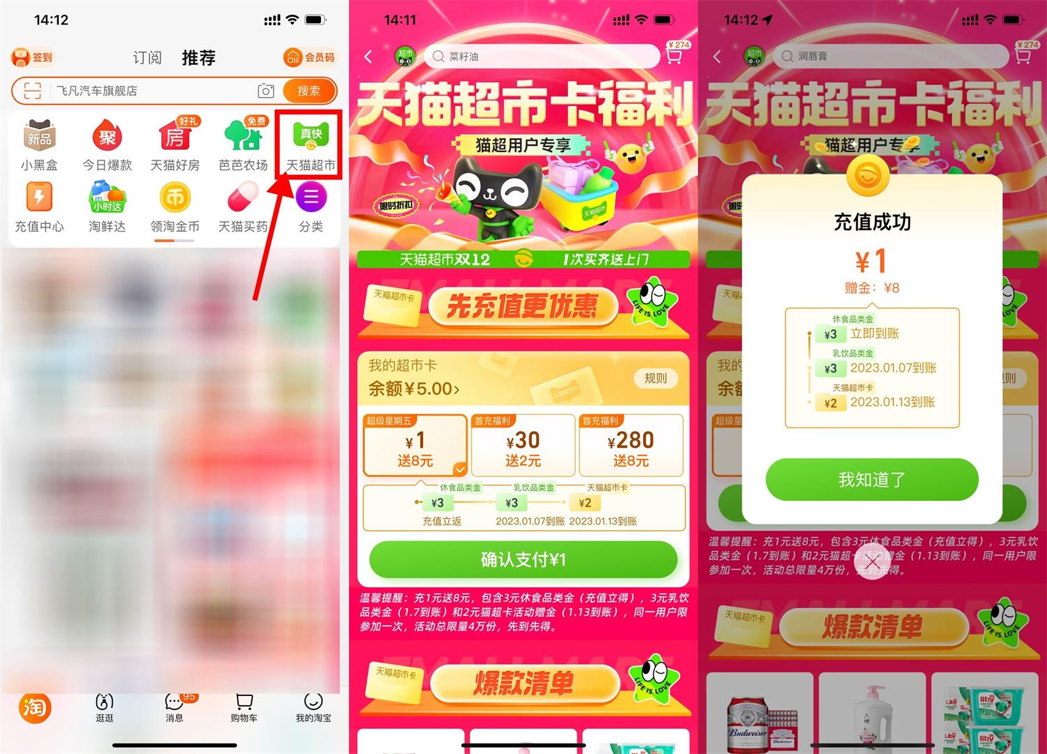 淘宝首页“天猫超市”->顶部搜索“猫超卡”->充1元猫超卡送3元食品休闲进+3元乳饮品类金+2元天猫超市卡,每周自动到账一张