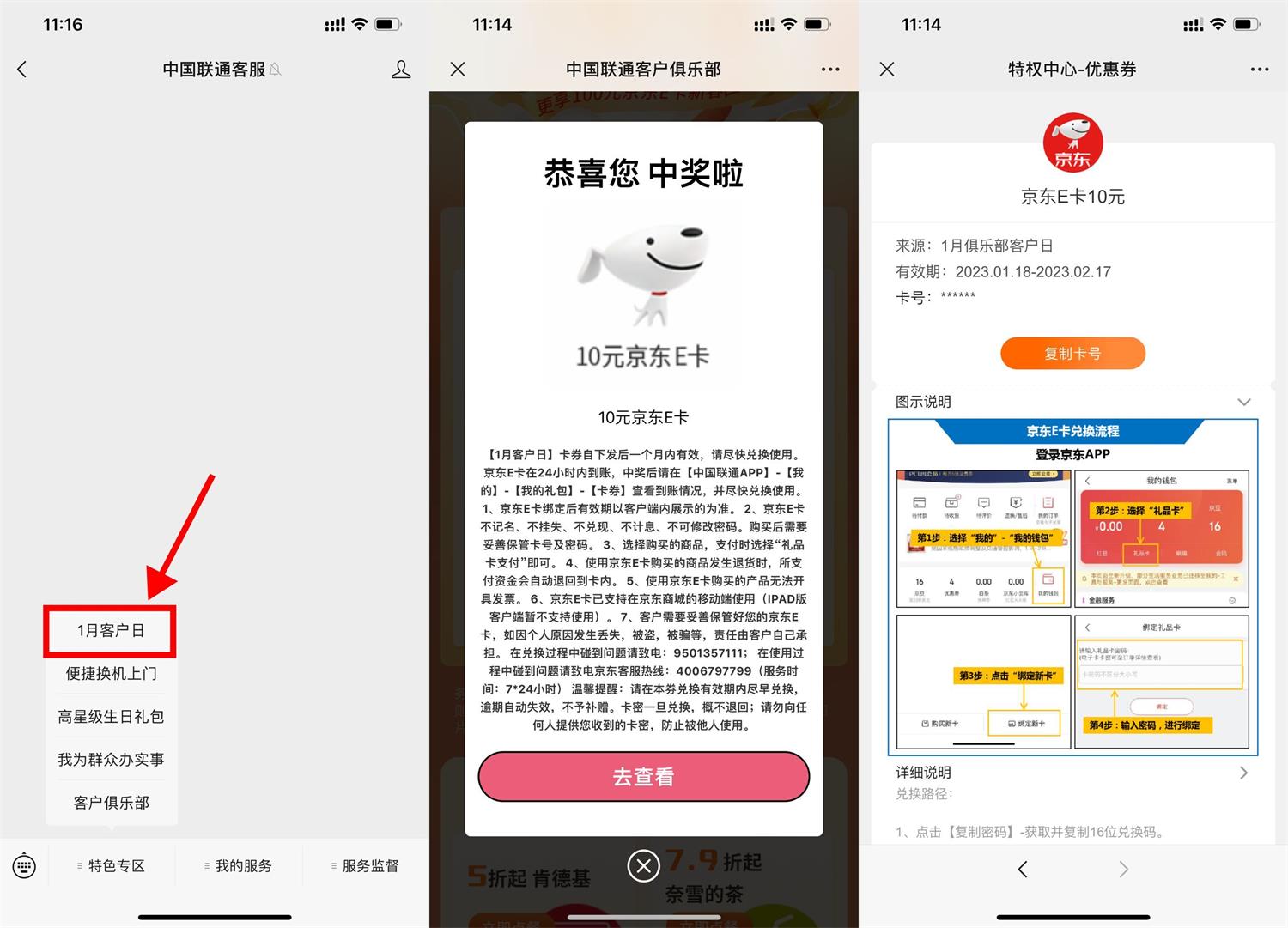 微信关注公众号“中国联通客服”->菜单栏特色专区“1月客户日”->抽中京东E卡才有用,根据页面提示兑换