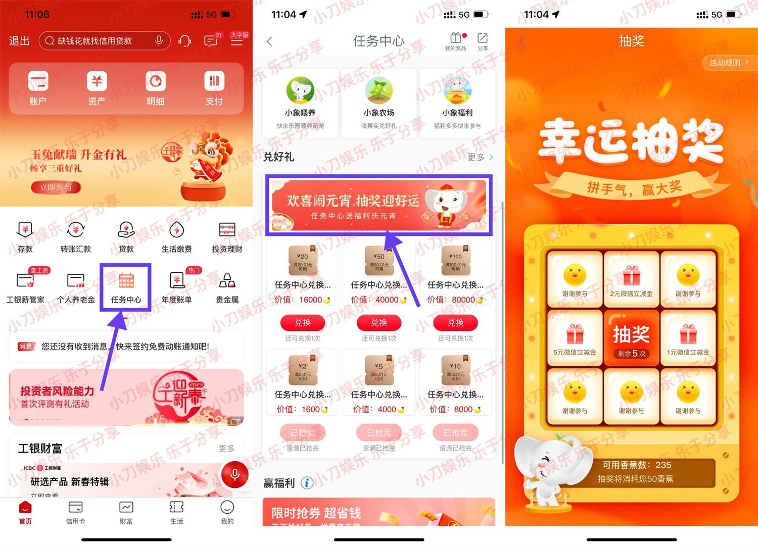 工行APP搜索“任务中心”->下拉点击横幅进入->每天签到可得随机香蕉,每50香蕉抽1次微信立减金