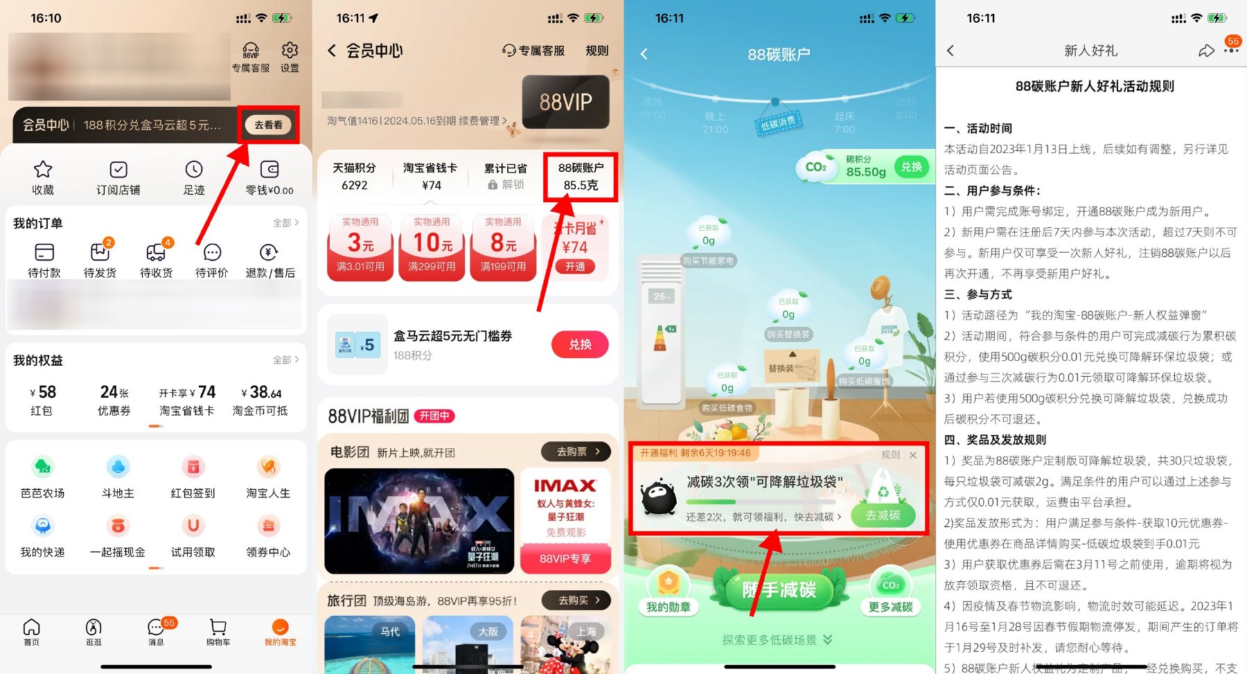 淘宝APP->我的->会员中心->88碳账户->简单拍3张照减碳3次,0.01元撸可降解垃圾袋包邮