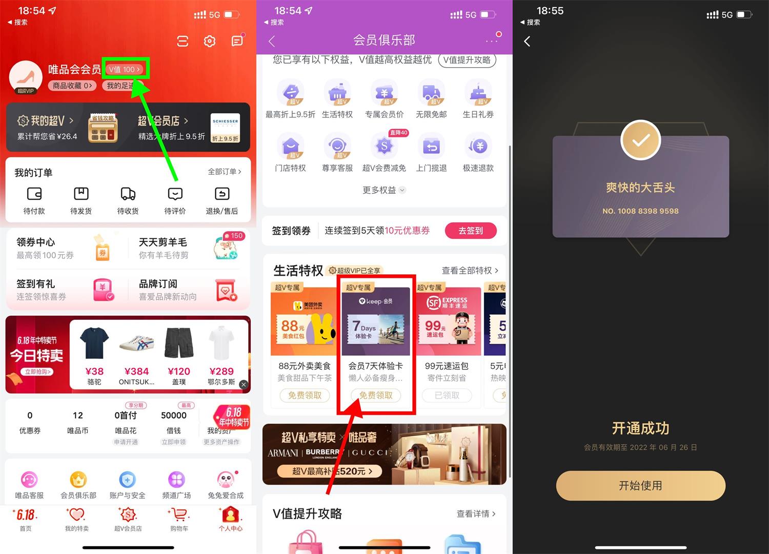 1、唯品会APP->我的->V值进入->下拉页面->会员7天体验卡->免费领取