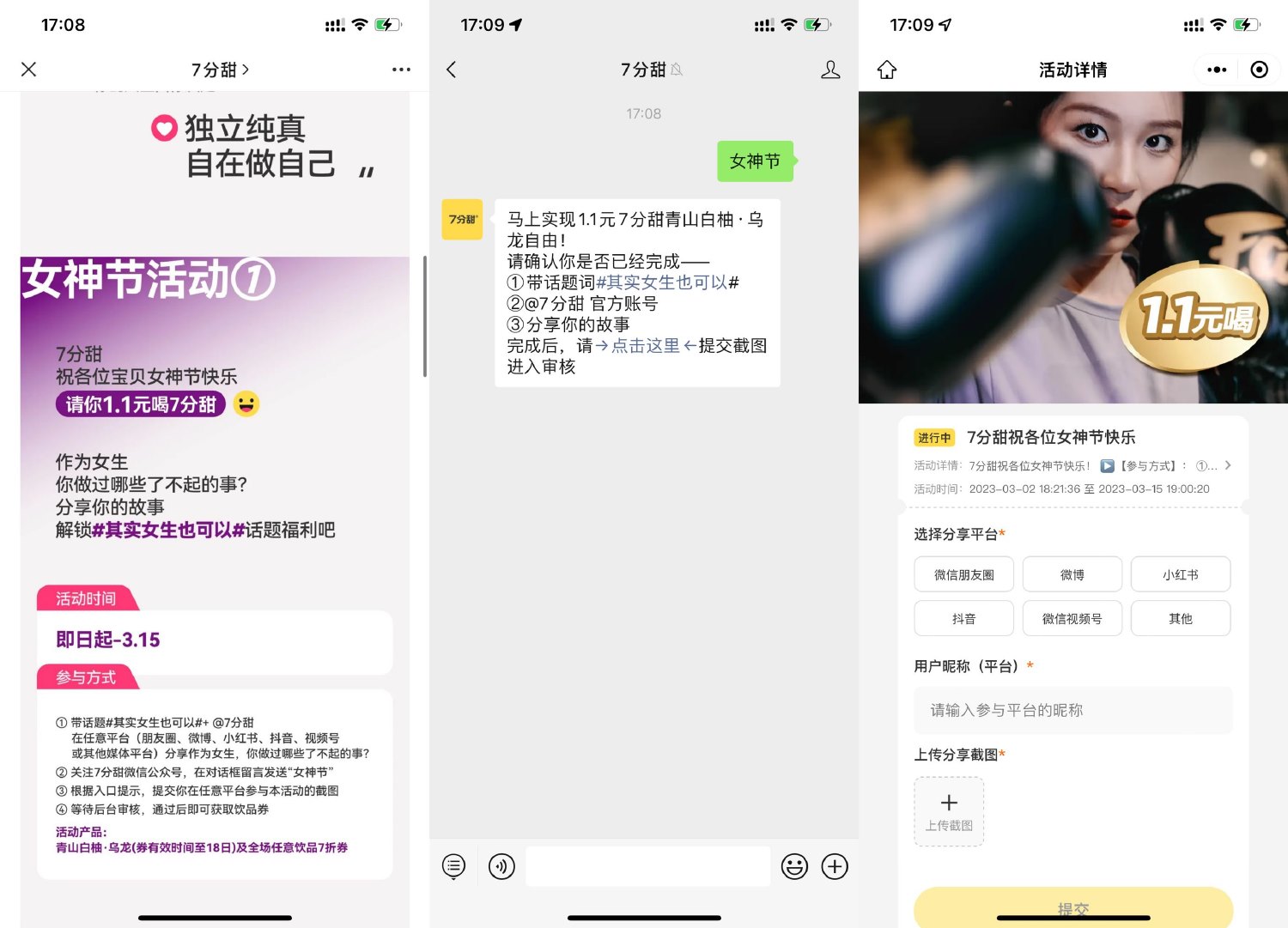 1、微信打开地址->根据页面提示发帖并截图->回复“女神节”进入提交截图