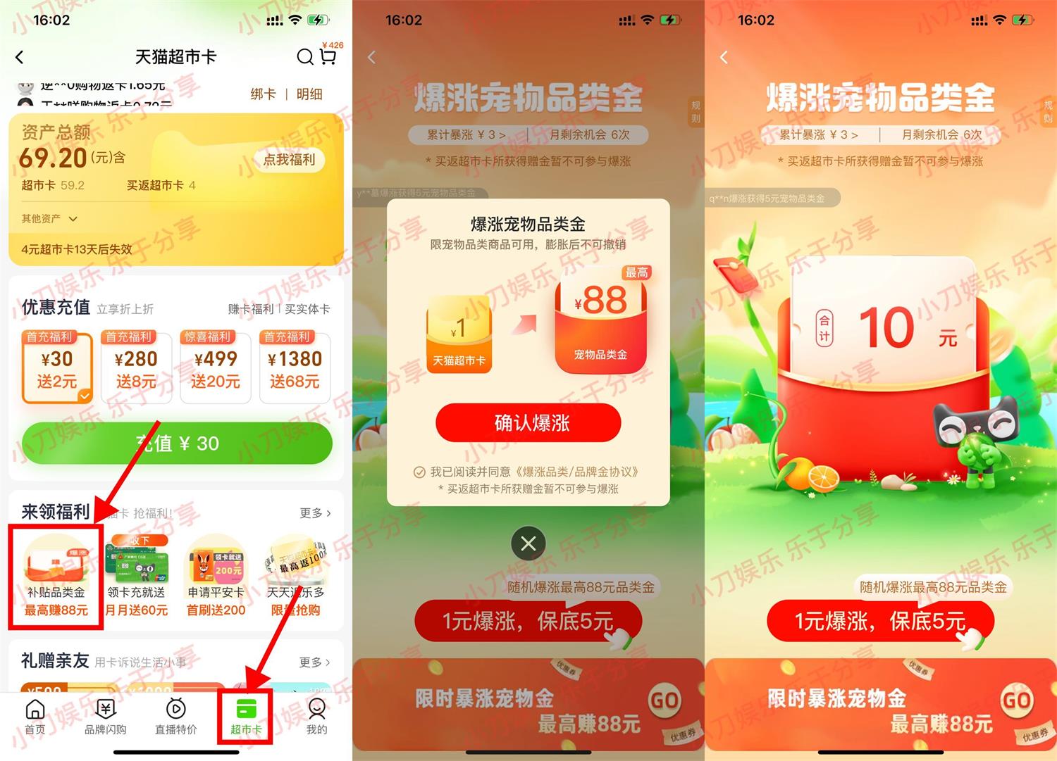 淘宝首页“天猫超市”->底部“超市卡”->补贴品类金->使用1元猫超卡暴涨,目前有水基本都是10元,等15天后品类金过期找客服补成通用猫超卡