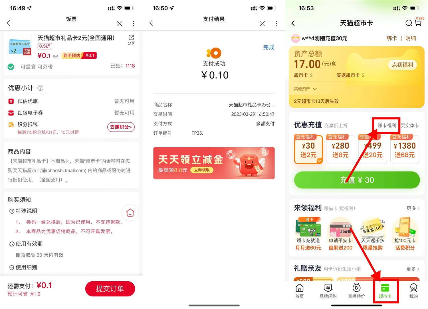 联通APP扫码->直接买然后复制兑换码->在“淘宝APP-天猫超市-超市卡-赚卡福利-权益兑换中心”中粘贴兑换