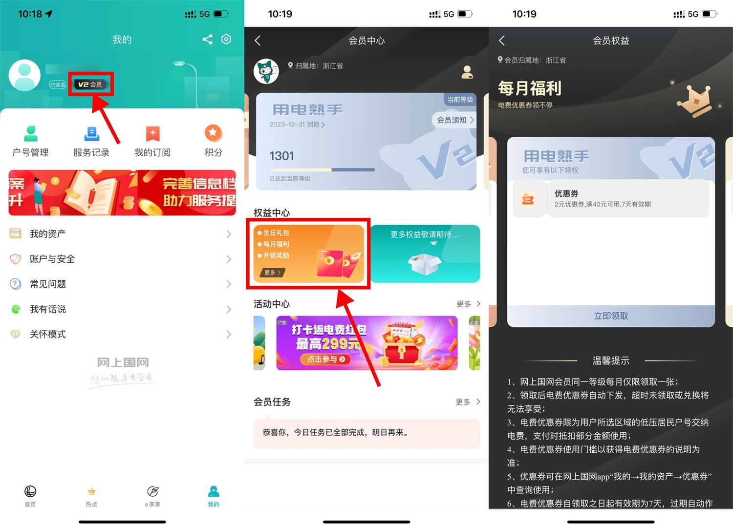 网上国网APP->我的->V会员->权益中心->可领生日礼包、每月福利、升级奖励等电费满减券,每个地区的券都不一样!