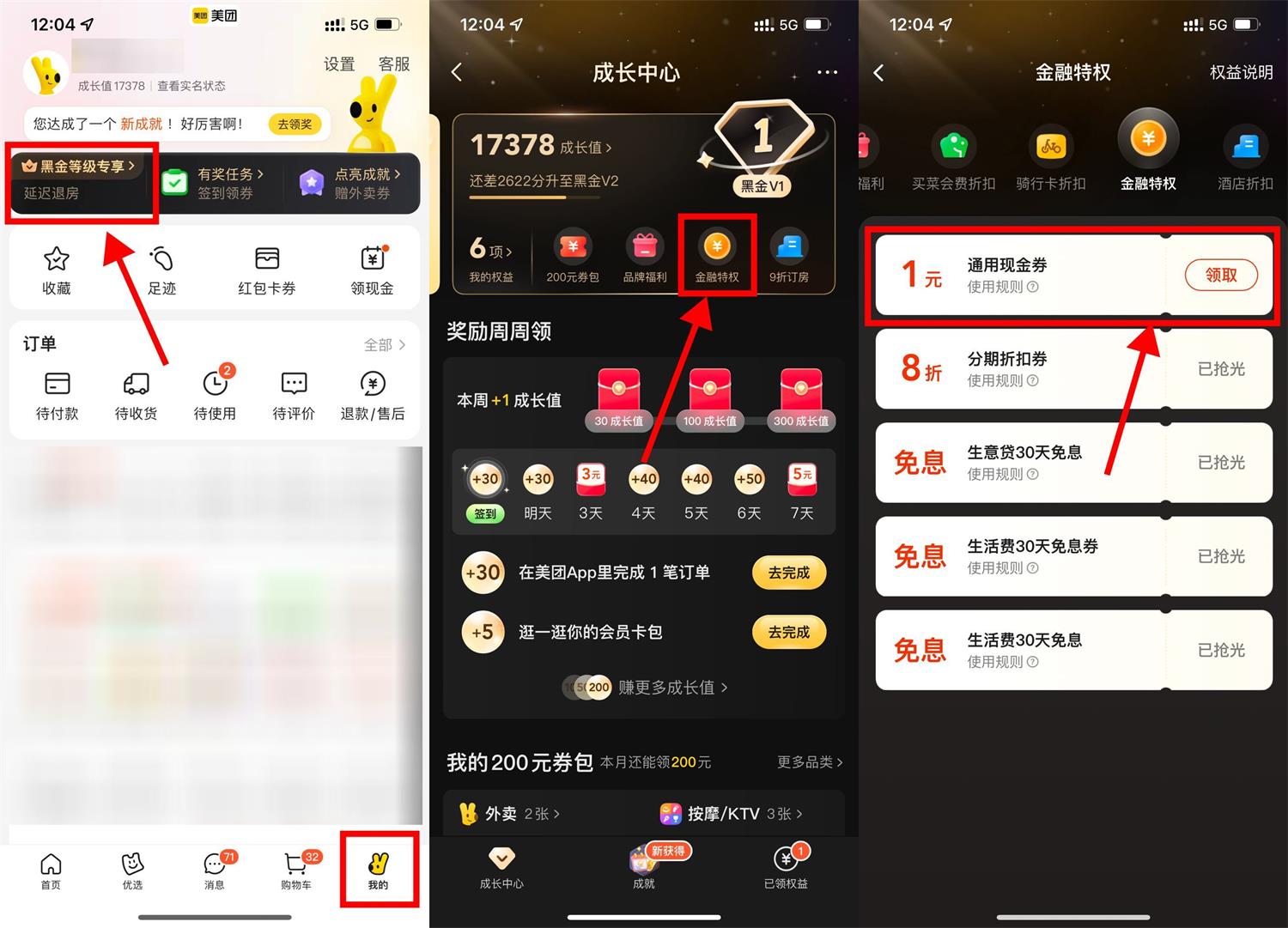 美团APP->我的->会员等级进入->金融特权->领取1元通用现金券