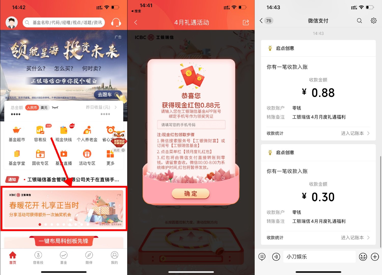 工银瑞信APP->首页横幅“春暖花开”->默认有1次机会,分享再得1次机会->抽中红包根据页面提示领取秒到