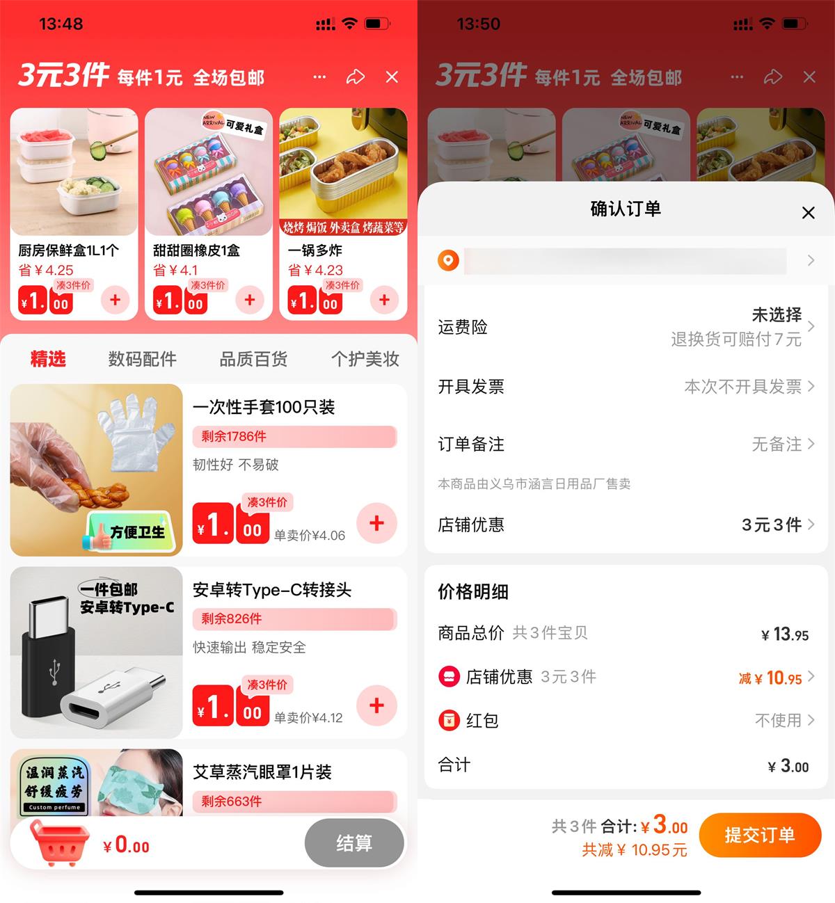 淘宝打开->任选3件实物一起结算就是3元包邮,每天都可以参与!