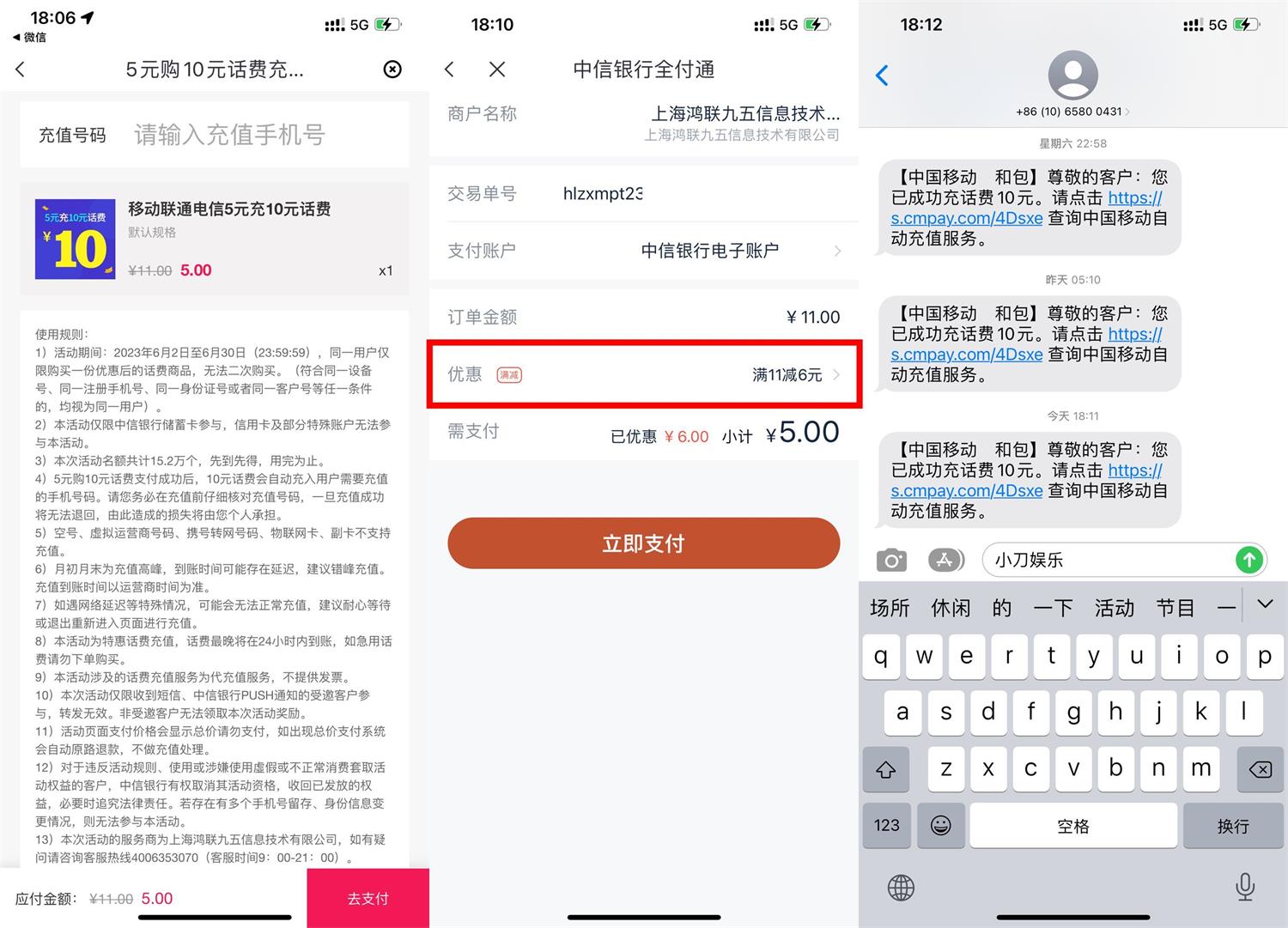 中信银行APP扫码->填写手机号直接充(选择“中信卡”才能看见满11减6元)