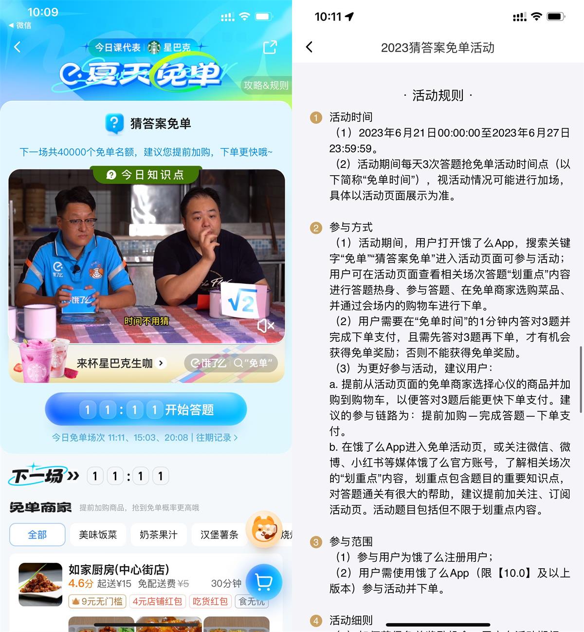 饿了么APP最新版->搜索“免单”进入->每天3场时间点,需准点开始 在1分钟内答对3题并下单,且下单名次在免单名额数量内即可获得免单(等送达之后才能知道有没有免单)