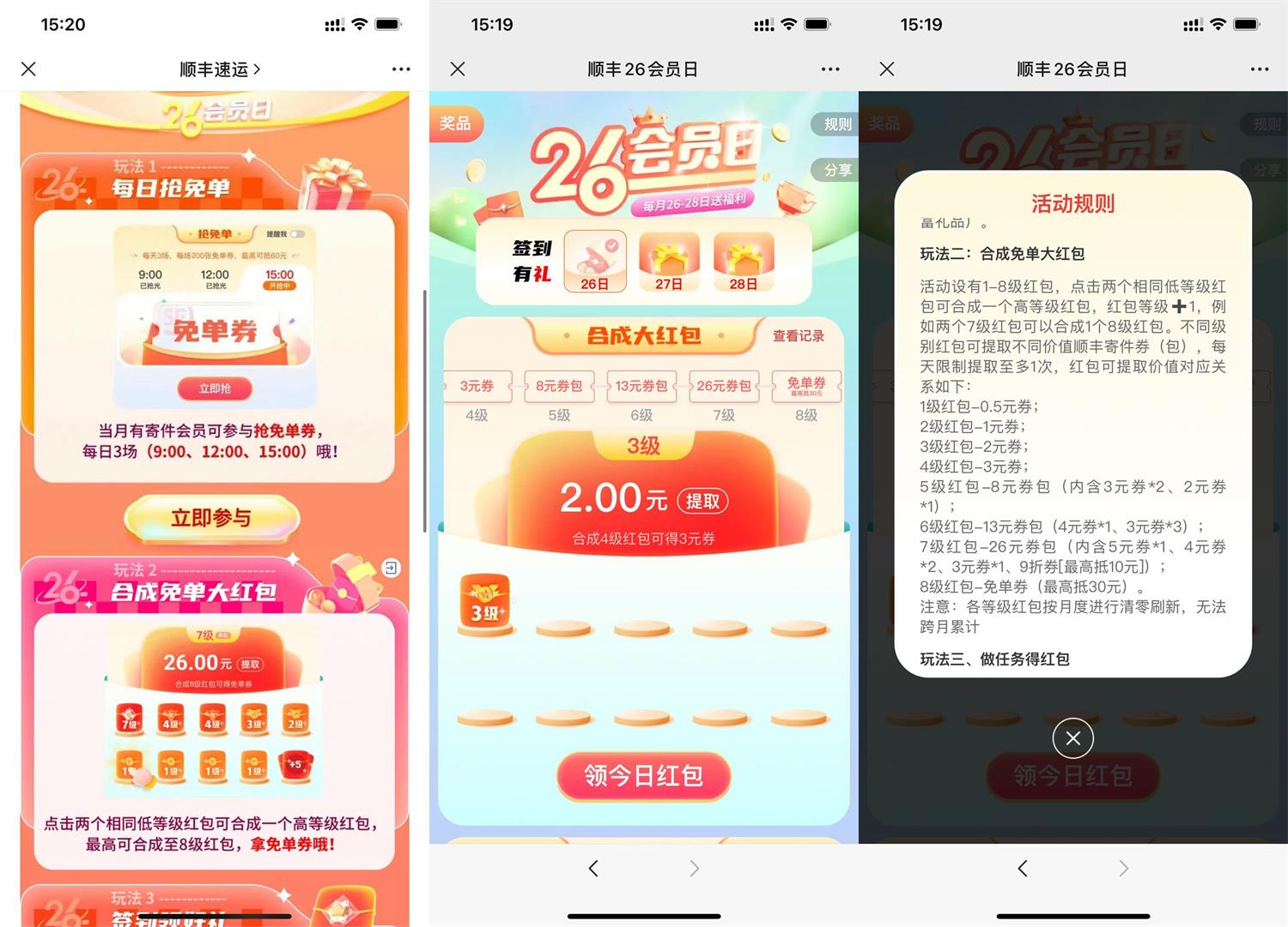 信打开地址->每天简单浏览得1级红包,合成红包到8级即可领取顺丰30元寄件免单券