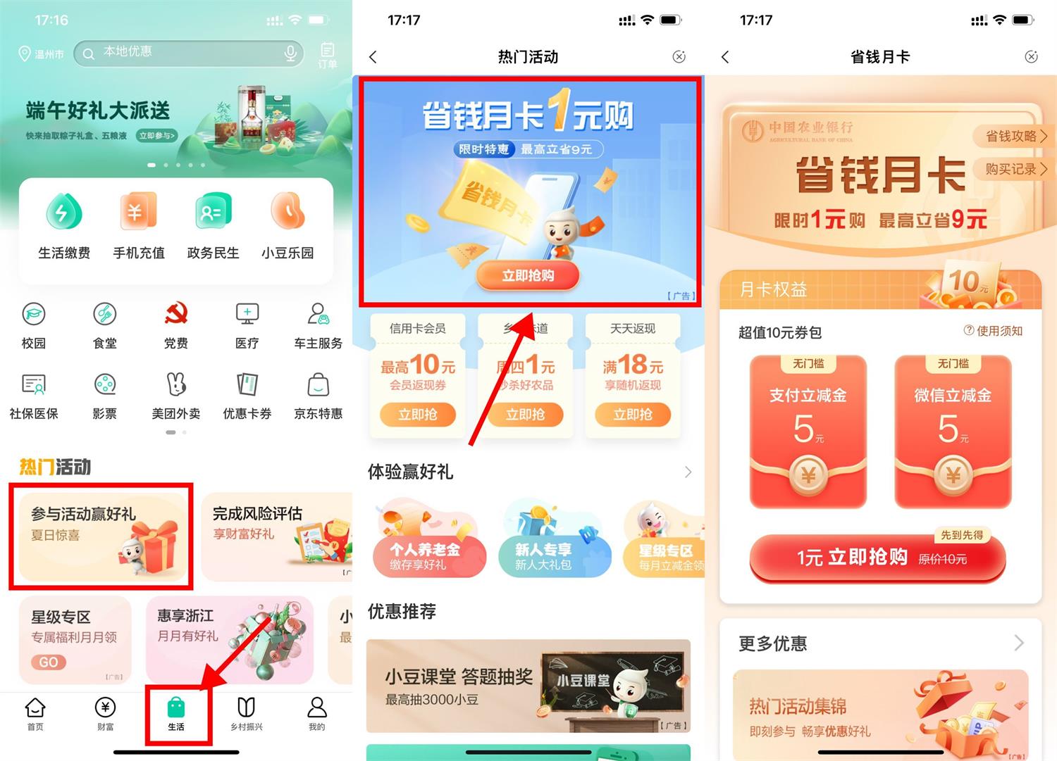 农行APP底部“生活”->参与活动赢好礼->省钱月卡1亓购->1亓买5元微信立减金+5元农行支付立减金
