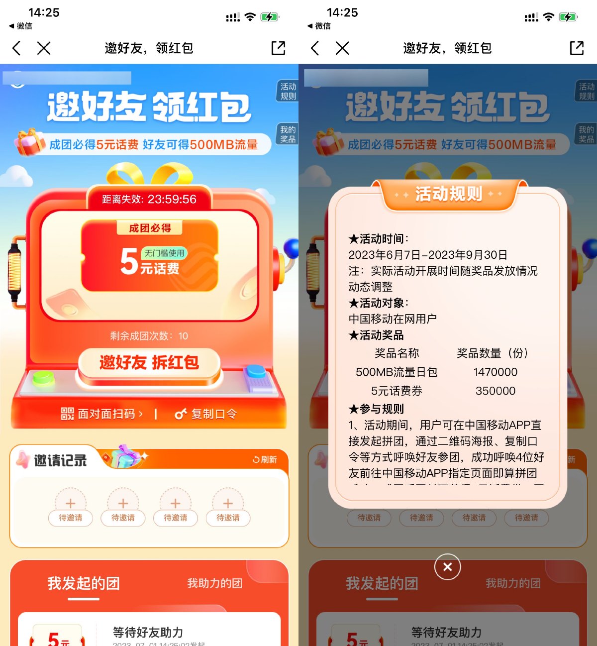 打开地址跳转到移动APP->开团邀请4个好友助力得5元话费券,最多可开团10次共50元话费