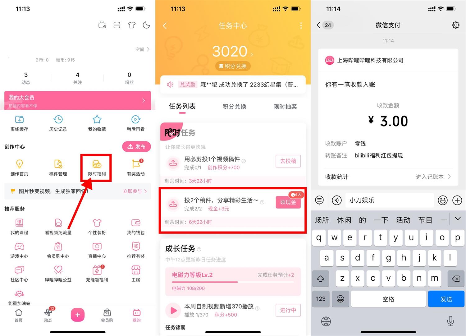 哔哩哔哩APP->我的->限时福利->限时任务->随便发视频等审核通过->领取红包提現秒到