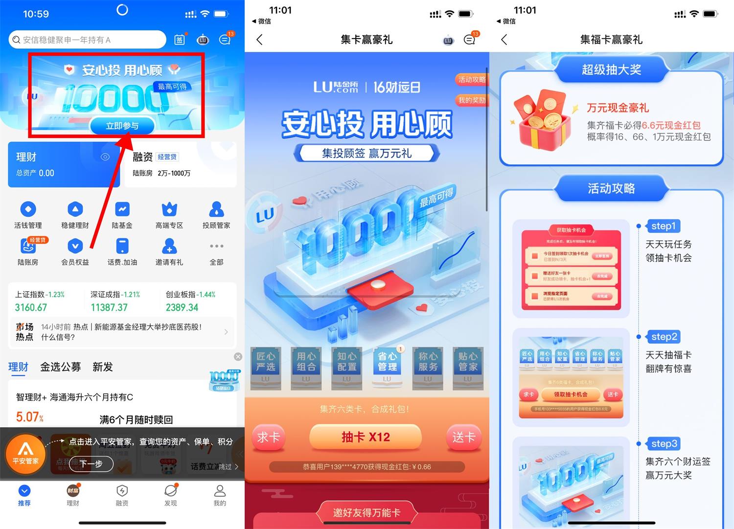 陆金所APP->首页横幅进入->做任务得抽卡次数->集齐6张卡片必得6.6元->需实民綁卡提現