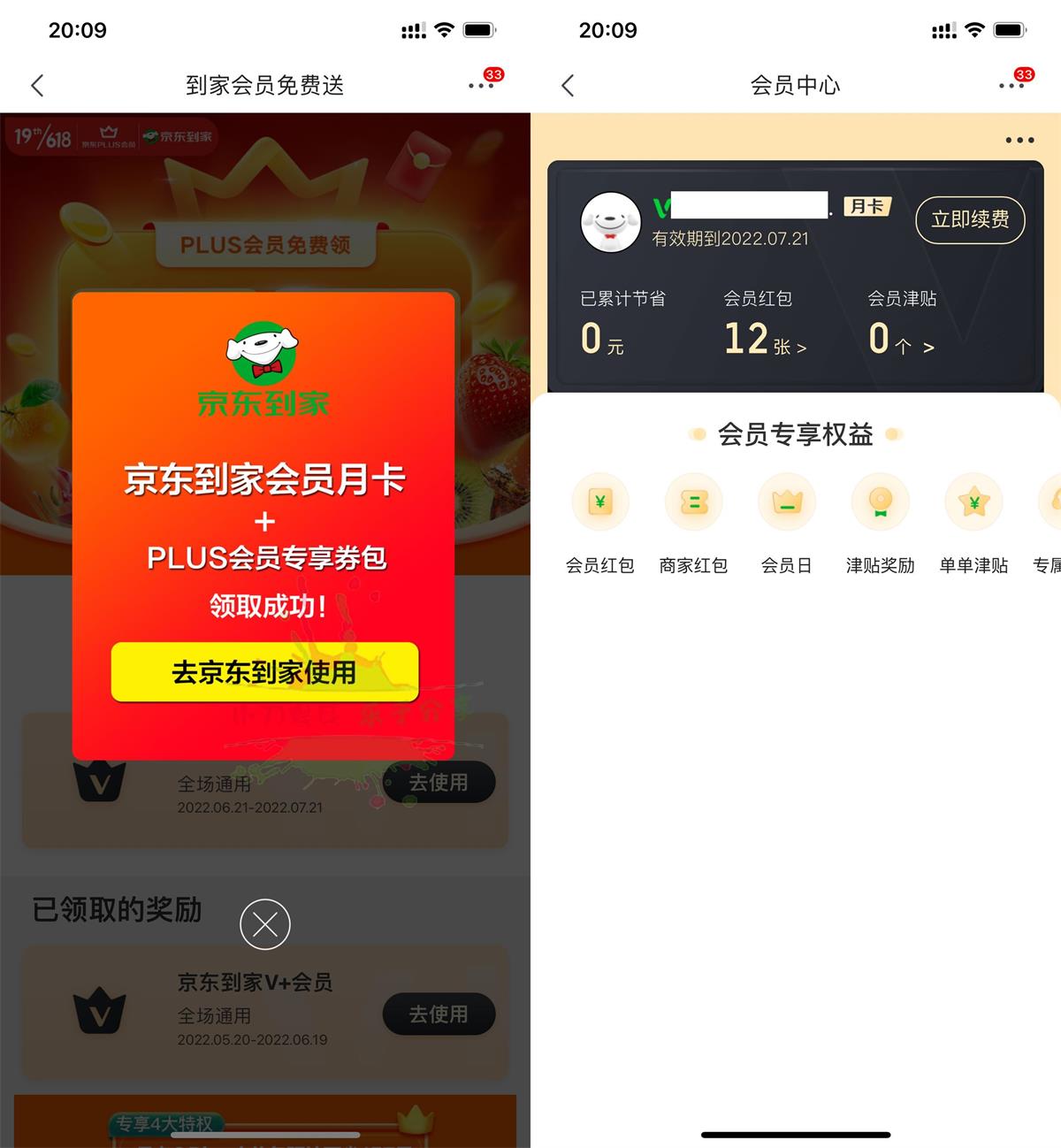 京东APP扫码->免费领取->秒到账京东到家会员月卡