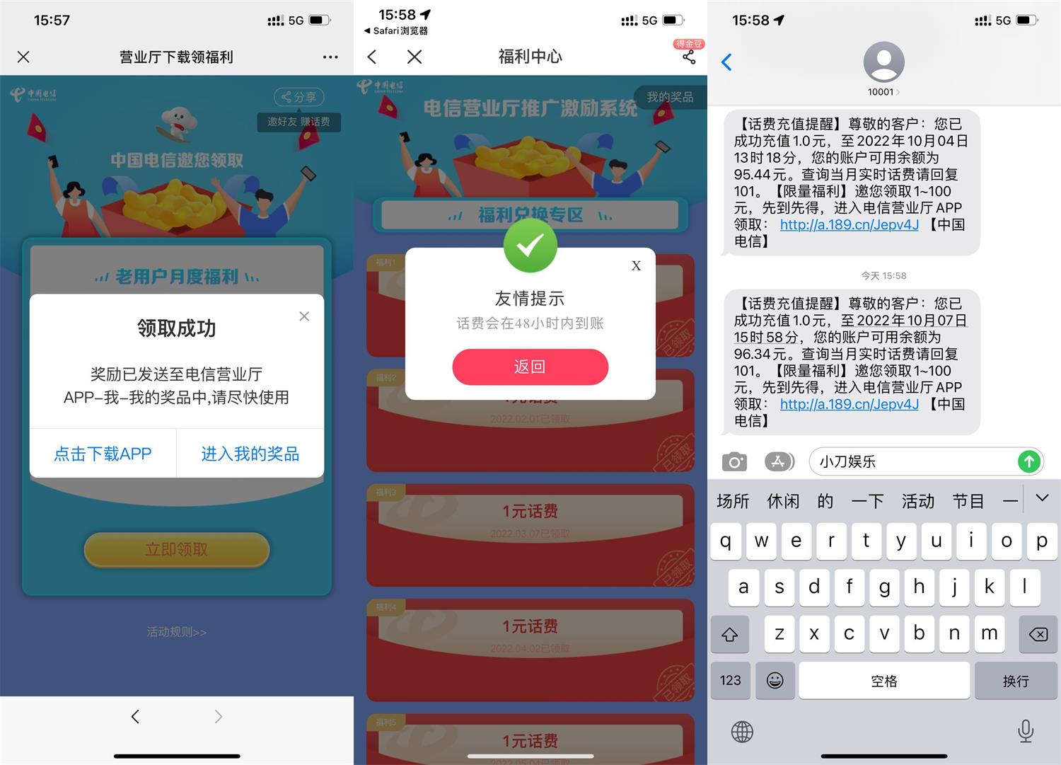 打开地址->输入手机号领取->根据提示跳转到电信APP->自动抽1~100元话费