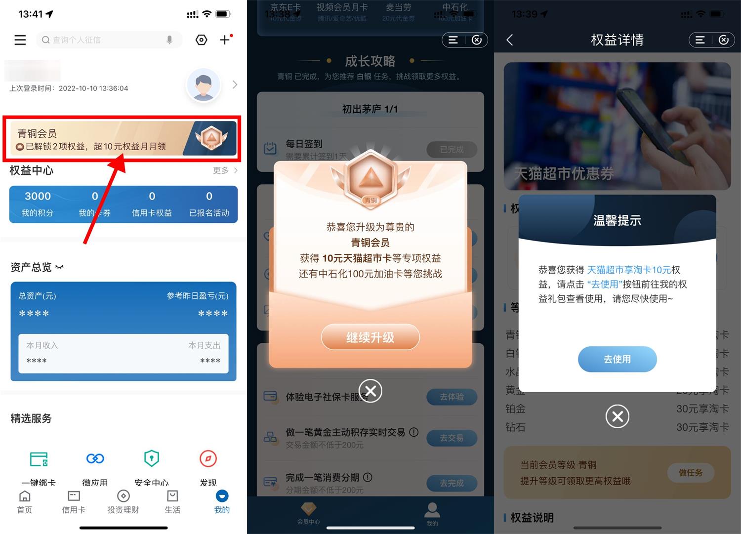 2、全部任务完成->升级到青铜会员->领取10元猫超卡->根据页面提示兑换