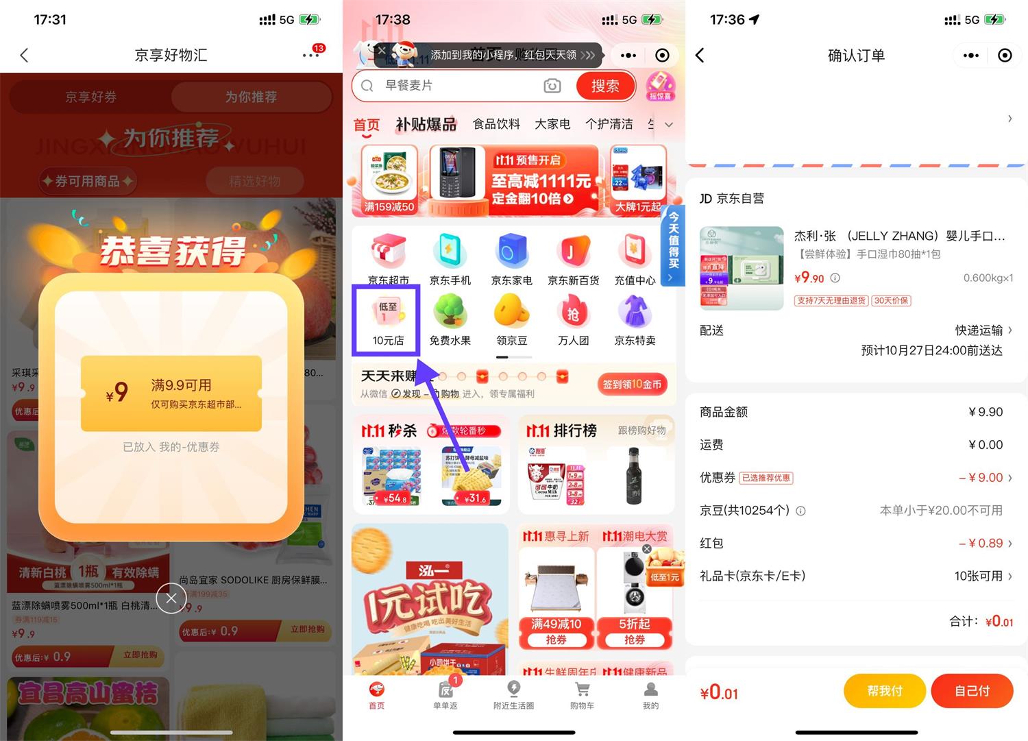 京东APP扫码->自动弹出9.9减9元券->选择自己想要的实物加入购物车->在“微信-发现-购物-10元店”领取签到红包和膨胀红包->最后返回购物车结算