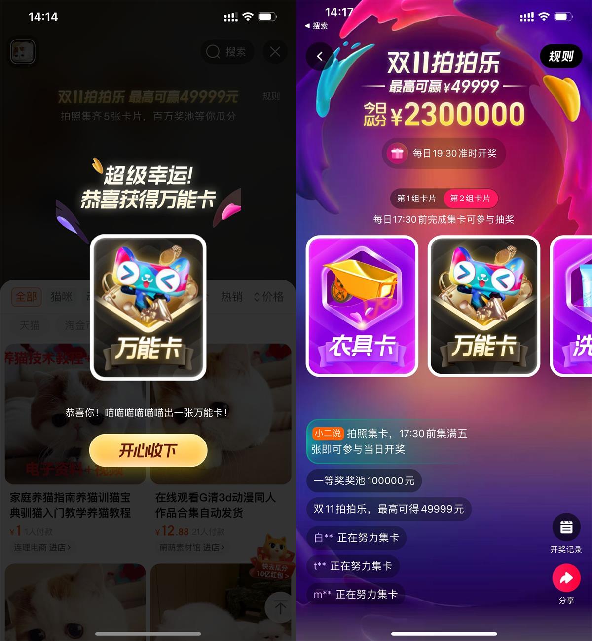 淘宝搜索“拍拍乐”进入->对着不同的物品拍照搜索即可获得卡片->每集齐一组5个卡片,即获得1次抽奖机会,分享还可得1次集卡机会